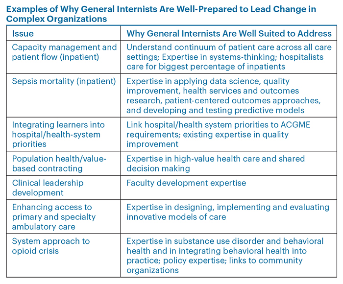 As general internists, we are well-prepared to lead change in complex organizations. The accompanying table provides examples of ways in which general internists are well suited to address common issues encountered in academic medical centers. Our role as leaders in this complex environment is helping others make sense of what is going on around them.