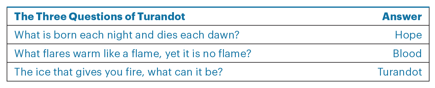 Calaf is a brave prince from an unknown land who falls in love with the princess and declares his suit. She presents her riddles and, in triumph, the unknown prince answers them correctly (see table). Turandot despairs and the prince takes pity—offering the princess a riddle of his own—“If before morning you can discover the name I bear, I shall forfeit my life.” But Calaf’s riddle risks more than his own life since the princess then decrees that none shall sleep, under penalty of death, until the name of the unknown prince is discovered. Calaf admonishes the princess for her cruelty and Turandot’s strength and desire for revenge leave her, and she weeps for the first time. Calaf then reveals his true identity thereby putting his life in Turandot’s hands. With the arrival of dawn and the assembly of the court, Turandot addresses the emperor and the people and states: “I have discovered the stranger’s name—it is Love!”