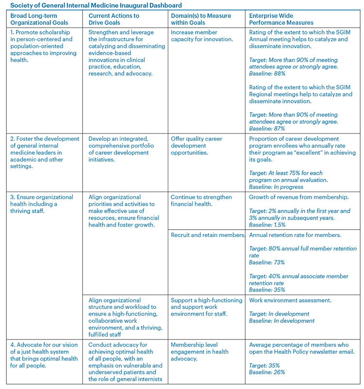 Third, the metrics aren’t completely identified. One of them is the assessment of the impact of the career development programs. Members will recall that amongst many new additions to the SGIM staff is Dawn Haglund, in a newly formed role of Director of Education. Dawn joined us just a few weeks ago and will, in partnership with the career development program leaders, recommend a starter metric. We also are in development for a metric to track the workplace environment at SGIM. These areas are of high importance to the Council and the organization overall so even though we may not have baseline measures until 2020-21, we wanted to leave these placeholders to signal to everyone involved that we need to fill in these gaps by the end of May 2020.