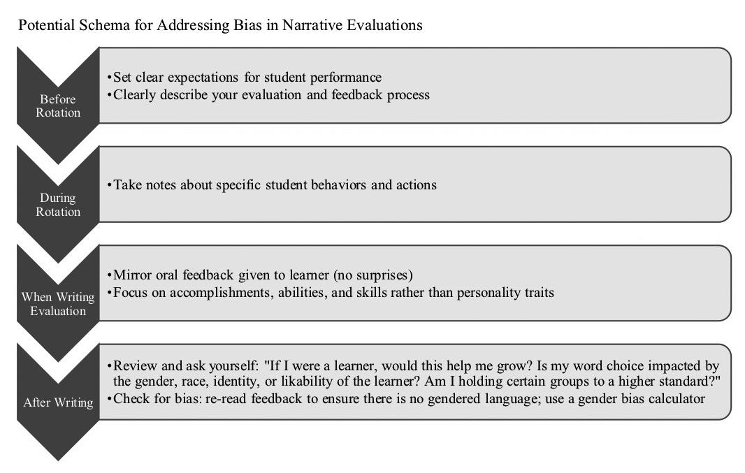 As a starting point, it is important to teach residents to proactively reflect on one’s biases and consider how these biases could influence written evaluations. When writing an evaluation, consider whether the words chosen would be used for a learner of another gender or race/ethnicity. Best practice is to focus on accomplishments, abilities, and skills, rather than personality traits. One simple approach that can be shared with supervising residents to minimize unintended bias in feedback is shown in the figure; this offers checkpoints for evaluators before, during, and after interactions with junior trainees.5 Set clear expectations with students and outline your evaluation and feedback process so they know what to expect. Throughout the rotation, make notes of laudable actions, directly observed behaviors or accomplishments by the student, and areas to offer specific constructive criticism. When writing narrative feedback, draw focus away from personality traits (no matter how positive) and emphasize what the student did during the rotation and how they grew as a trainee. Consider using a gender bias calculator or having a trusted colleague read your feedback to ensure it is not gendered. Finally, ensure written feedback matches what you have shared with the student verbally.
